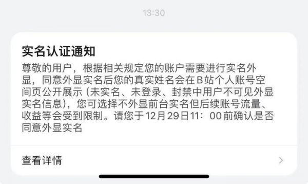 B站的通知显示,已经实名外显的账号将获得更多的流量和变现的支持,包括更多的推荐位、更高的广告分成、更多的打赏机会等。如果在本月底前未完成实名外显,该账号的公域流量和广告分成、打赏将受到限制,但账号的基础功能使用不受影响。