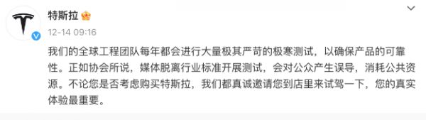 同日,特斯拉方面也发文称,其全球工程团队每年都会进行极寒测试,确保产品可靠性,“媒体脱离行业标准开展测试,会对公众产生误导,消耗公共资源”。