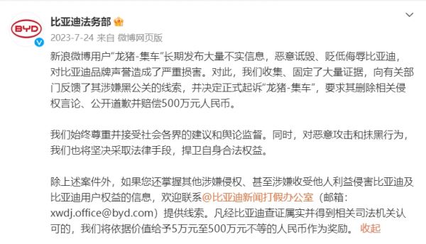2023年5月,蔚来、小鹏汽车、零跑汽车陆续开通法务部的官方微博账号,吉利和长城汽车则分别成立了网络举报中心,主要负责处置损害品牌形象的网络不实信息;2023年7月,比亚迪也开通了法务部官方微博,首条内容即宣布已经收集大量证据,将正式起诉自媒体“龙猪-集车”,要求其删除相关侵权言论、公开道歉并赔偿500万元人民币。