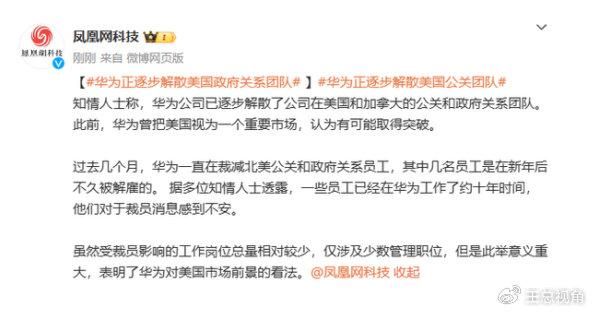 就在最近,凤凰网科技爆出一条大消息,华为正逐步解散在美国和加拿大的公关团队。过去几个月来,华为不少相关部门的员工都被裁了。