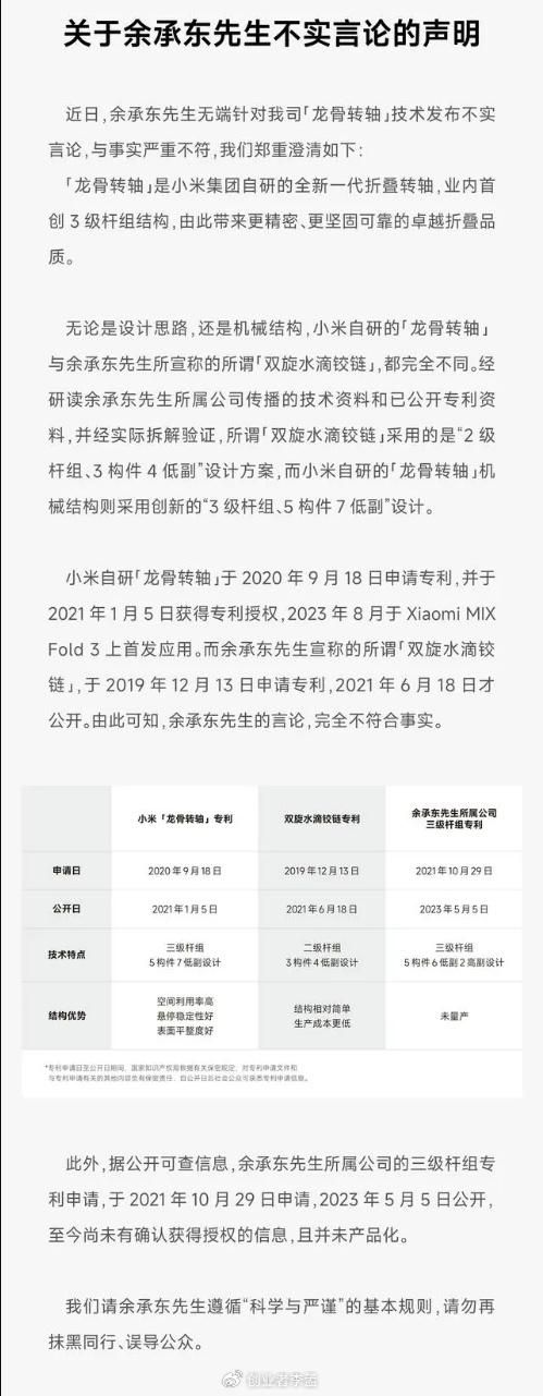 例如在2023年的花粉论坛上,余承东表示:余承东在演讲中半开玩笑半认真地提到了友商抄袭华为的知识产权的情况,尤其是指出了友商将华为的双旋水滴铰链改名为龙骨的行为。尽管余承东并未直接指责小米,但这一言论显然触动了小米,随后他们迅速发布了澄清声明,详细说明了龙骨转轴和华为双旋水滴铰链的专利申请时间、设计、结构等方面的差异,认为余承东的言论与事实严重不符。小米的澄清声明及回应。