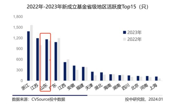 而根据CVSource投中数据显示,2023年,山东省新成立基金1162只,数量仅次于浙江省、江苏省,位居全国第三,并与浙江、江苏、广东三省共同构成数量超千只的第一梯队。