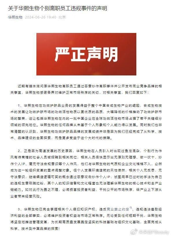 在这份声明中,华熙生物称“已完全掌握相关个人侵犯知识产权、违反竞业禁止约定、违规违法套取经济利益的全部事实,必将维护投资者权益与市场正常秩序”。