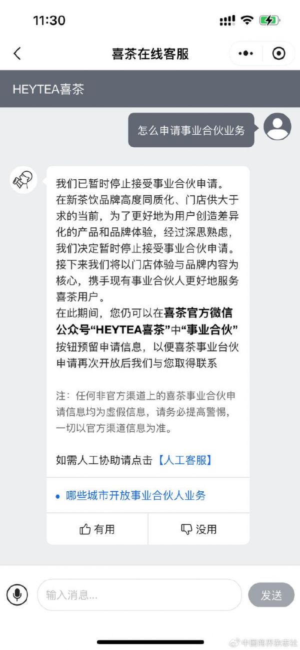记者从喜茶官方客服处了解到,喜茶只是暂时停止接受事业合伙的申请。在此期间,有意向加盟的合伙人仍可通过喜茶官方微信中的“事业合伙”按钮预留申请信息,等待喜茶事业合伙申请再次开放后取得联系。