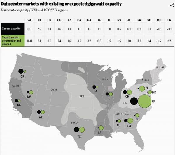 (圆圈大小代表1吉瓦的IT容量——即可以为计算机服务器及其配套的机电设备提供的净电力容量)