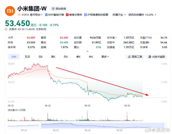 接连两个交易日的暴跌,让小米股价从59.45元,一路跌至53.55元,一共跌去了5.9元。