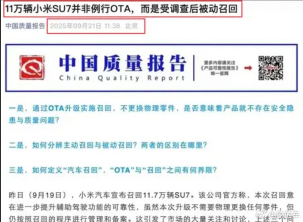 但国家市场监管总局主管媒体的公众号,却发布了一篇文章,标题为《11万辆小米SU7并非例行OTA,而是接受调查后被动召回》。这意味着,官媒直接打脸小米,揭露了小米汽车召回的真相。
