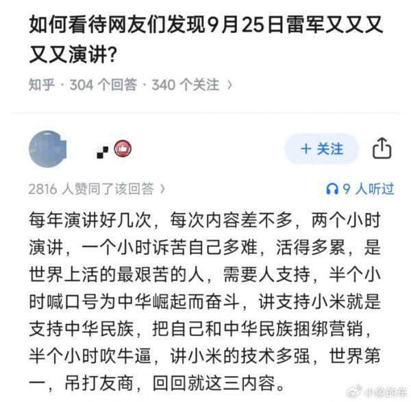 雷军本次演讲中,延续了“焦虑-反思-逆袭”的模块化叙事套路,像极了一碗反复加热的“老鸡汤”。这种“雷式鸡汤”,已让很多人产生审美疲劳。