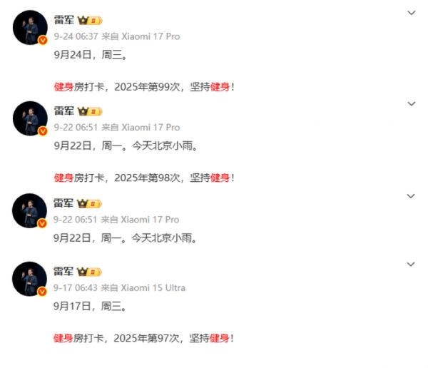 细心的网友发现,雷军每次晒健身打卡的时间都在早上7点前。即便冬天也雷打不动,这种自律程度,让不少健身爱好者都自愧不如。