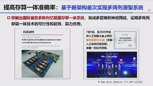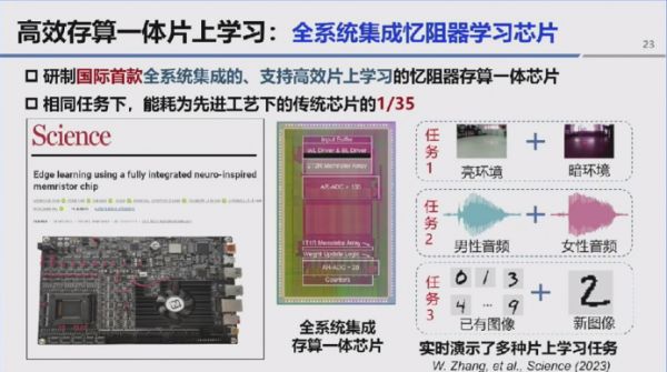 在产业化推进方面,忆阻器存储技术已相对成熟,台积电也在推进 12 纳米及更先进节点的忆阻器存储工艺研发。团队孵化的企业已实现 1-16MB 典型规格忆阻器存储产品的量产。在存算一体领域,团队孵化 “北京亿元科技” 初创公司,既推出面向科研的存算一体硬件平台,与多所高校开展合作,也联合咪咕、字节跳动研发存算一体计算加速卡,在内容推荐场景开展探索性应用。