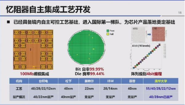 过去四年多,团队与中芯国际合作研发出覆盖55 纳米、40 纳米、28 纳米、22 纳米至 12 纳米多个节点的忆阻器集成工艺。由于忆阻器集成于CMOS 后道,具备良好的工艺迁移能力,可适配更先进的工艺节点。目前团队已形成境内自主可控的工艺基础,忆阻器集成规模达上百兆,良率可达 4 个 9 至 6 个 9,实现 4 比特编程,且 40 纳米、28 纳米节点的存储产品已实现一定规模量产,工艺水平进入国际第一梯队。