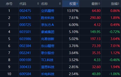 指数成分股看,消费电子指数十大权重看,立讯精密目前持仓占比已超13%,其次为胜宏科技、京东方A等。