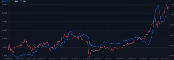 拿规模最大的华夏消费电子ETF(159732)看,份额(下图蓝)与股价(下图红)同步上扬。