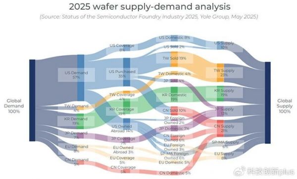 可以看到,在需求方面,美国拥有全球57%的晶圆代工需求,中国台湾是4%,韩国是19%,日本是7%,欧洲是8%,,中国大陆是5%,。