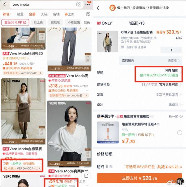目前,已经有不少品牌尝到甜头。比如ONLY,在淘宝主页搜索商品时,就会显示“支持闪购”的标签,用户点进去即可选择附近门店配送,配送费一般在5元左右,这一机制让电商流量与即时零售场景实现了深度融合。