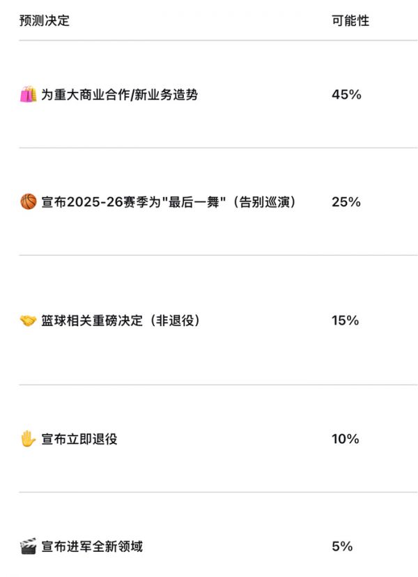 商业优先:最大的可能性依然指向商业行为。勒布朗早已超越了一名纯粹运动员的范畴,他是一个品牌、一位企业家。将个人重大生涯节点的预告与商业活动绑定,能产生1+1>2的传播效果,这非常符合他团队的运营策略。