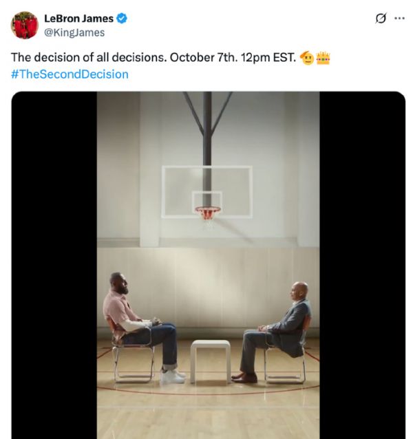 10月7日,NBA洛杉矶湖人巨星勒布朗·詹姆斯在社交媒体发布了一个名为“第二次决定”的短视频。“第二次决定”将在北京时间10月8日0点正式对外公布。