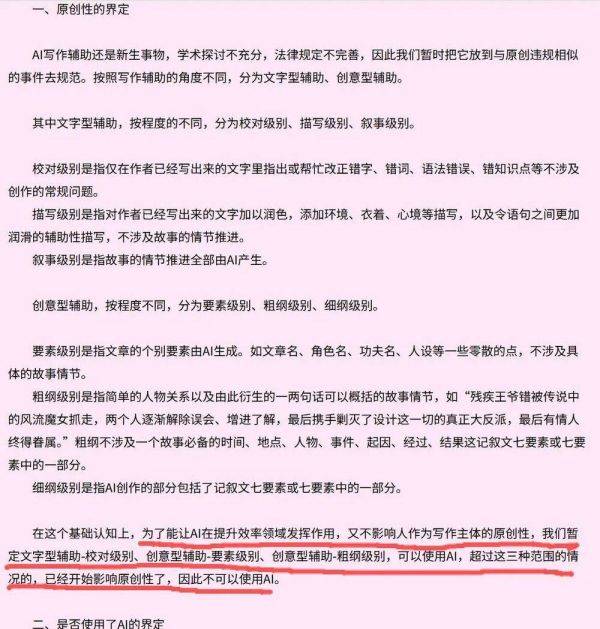 晋江文学城创始人黄艳明于2025年2月在网站作者论坛“碧水江汀”上发布《关于 AI 辅助写作使用、判定的试运行公告》。她在公告中提到,自己整个春节都花在与AI对话、查资料上,以拟清判定思路,并最终确定在晋江平台,只有文字校对、创意要素辅助、创意粗纲辅助这三种情况是可以使用AI的。