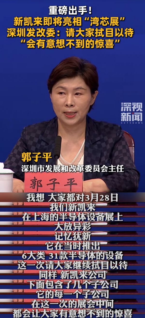 这次“湾芯展”,新凯来带着旗下几个子公司一同上阵,深圳市发展和改革委员会主任郭子平在介绍时,兴奋之情溢于言表,嘴角都快压不住那股自豪,激动地跟大家说“会有意想不到的惊喜”。