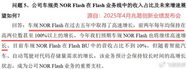 例如,公司车规NOR Flash业务过去五年(2020-2024年)增速迅猛,前两年同比增速均保持在两位数以上甚至超100%,2025年仍有望延续高速增长。