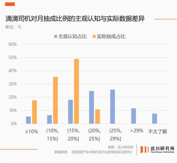 清华大学环境学院的调研,让以上误解有了具象化的感知。调研显示,71.8%的司机高估了自身抽成比例,其中超三分之一的司机认为月均抽成高于25%,实际比例仅为1/768。