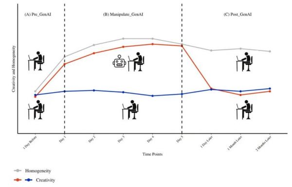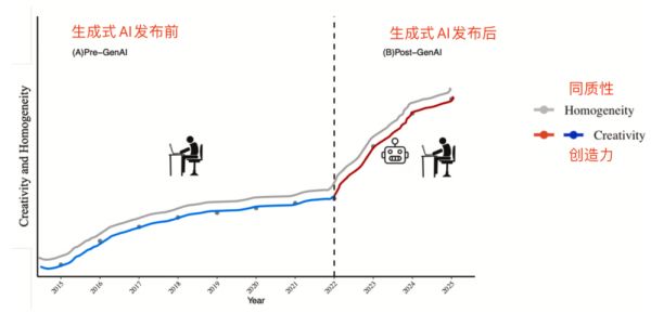 研究团队结合断点回归设计与机器学习等技术,为我们揭示了生成式AI对个人创造力与群体同质性的长期且真实的影响。