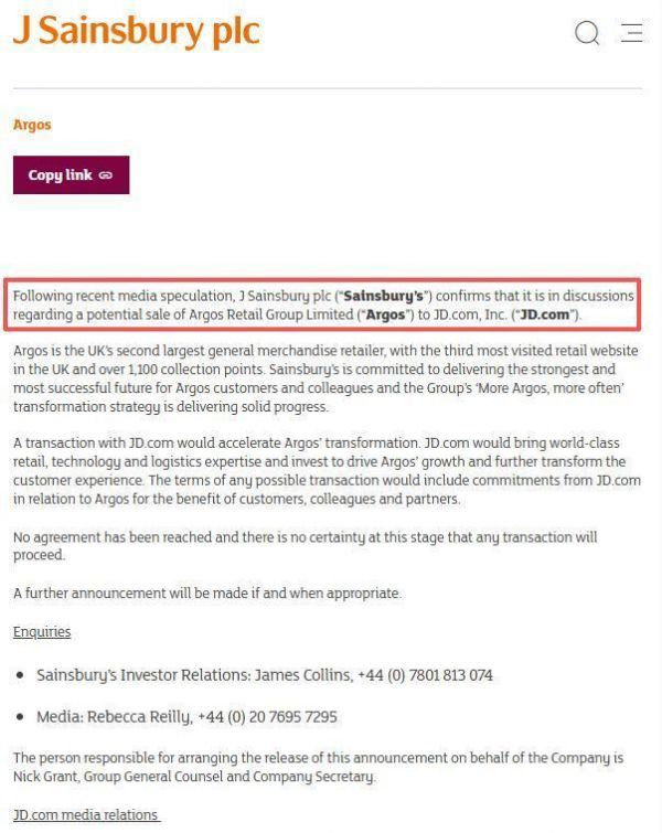 9月13日,英国第二大连锁超市集团森宝利(J Sainsbury plc)发布公告,确认与京东就出售Argos展开洽谈。Argos是英国第二大日用品零售商,拥有英国访问量第三的零售网站及超1100个提货点,其“线上+线下”模式被视为核心优势,这一点和京东比较类似。森宝利表示,京东的参与将加速Argos转型,并承诺注入零售技术及物流资源。
