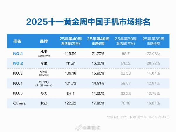 这是继小米17系列首销后,小米连续两周蝉联冠军。黄金周期间中国市场手机销量排名前五品牌分别为小米、苹果、vivo、OPPO、华为。
