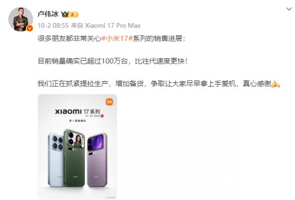 10月2日,卢伟冰发微博庆祝,表示小米17系列的销售量已经超过百万。