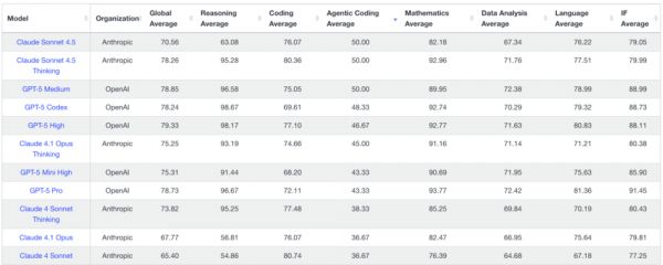选择Agentic Coding Average(智能体编程任务平均得分)后,模型排行榜,Claude Sonnet 4.5位于第一名。来源:https://livebench.ai/