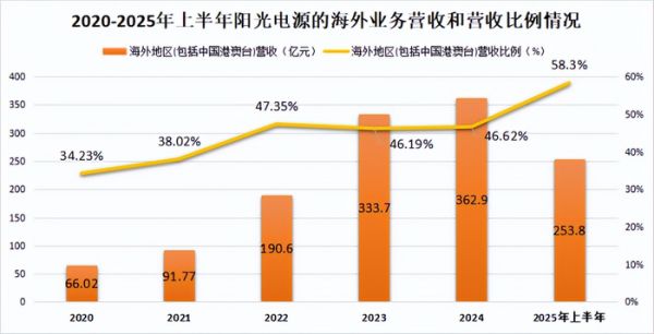 2025年上半年,其出海的势头更加强劲,海外营收达到253.8亿元,同比增速超过88%,占总营收的近六成,超越了国内业务成为阳光电源的主要收入来源。