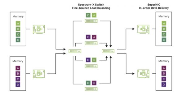 Spectrum-X采用包级自适应路由(Packet-level Adaptive Routing)与分包喷射(Packet Spraying)技术,通过实时监测链路负载,动态选择最优路径,并在 SuperNIC 层完成乱序重排。这种机制打破了以太网静态哈希路由(ECMP)的局限,使 AI 集群在流量不均时仍能保持线性扩展能力。