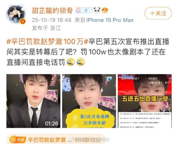 然而,还没熬到双11,辛巴又现身了,而且还充上了热搜,话题是:辛巴罚款赵梦澈100万。