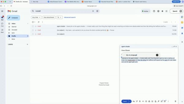 类似的是Cursor Chat功能,在网页的任何文本框中,用户用光标选中文字后可以直接调用ChatGPT进行内联编辑。比如在Gmail写邮件时,选中一段话,让ChatGPT“整理我的语言”或“改成更正式的语气”,修改后的文本直接替换原文。这确实省去了在多个标签页之间来回切换的麻烦。