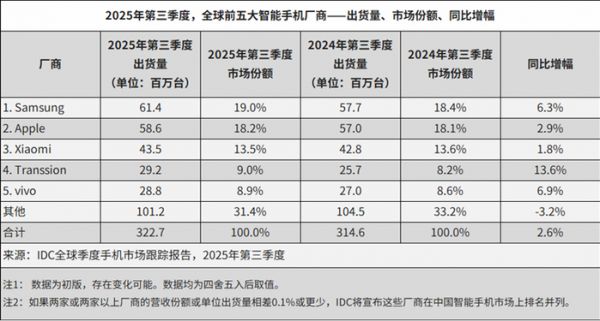 而在全球市场,OPPO更具挑战。根据IDC数据,2025年第三季度,OPPO未进入全球出货量前五,被归入“其他”类别。尤其是在传音与vivo实现增长的同时,OPPO在多数海外市场的增长势头尚未显现,全球影响力出现阶段性减弱。