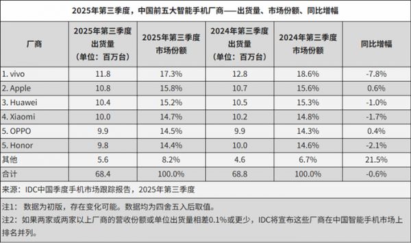 2025年第三季度,OPPO在中国智能手机市场的排名下移。根据IDC发布的中国季度跟踪数据,其当季市场份额为14.5%。在出货总量略有下降的大盘背景下,OPPO虽守住了基本盘,但其“平稳”或也意味着边缘化压力正在显现。