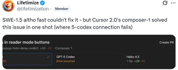 目前,已有一批开发者试用了两款模型。AI 专家兼博主 Simon Willison 在测试 SWE-1.5 后表示:“这款模型确实感觉非常快。与 Cerebras 合作进行推理,是一步非常明智的举措。”然而,也有用户在使用两款模型后称,“SWE-1.5 虽然速度快,但没能解决一个问题;而 Cursor 2.0 的 Composer-1 模型却一次性解决了该问题(在 5-codex 连接失败的情况下)。”