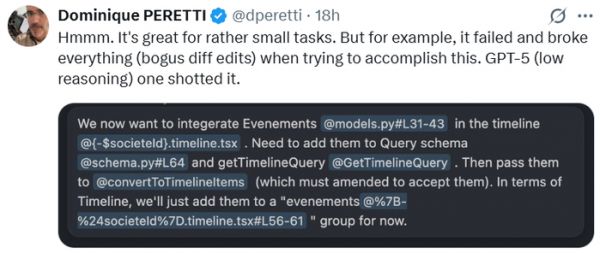 此外,还有用户反馈,“(SWE-1.5)它在处理小型任务时表现确实不错。但比如在尝试完成某项任务时不仅失败了,还搞砸了所有东西(出现了无效的差异编辑),而 GPT-5(低推理版本)一次就成功完成了。”