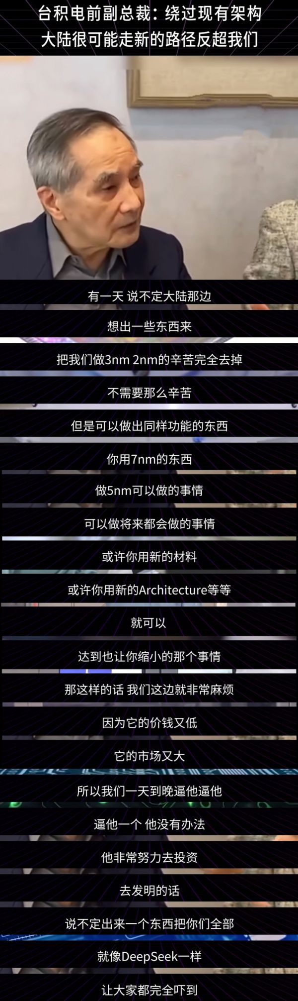 这位台积电前高管直言:“说不定大陆那边想出一些东西来,把我们做3nm、2nm的辛苦完全去掉……你用7nm的东西,做5nm可以做的事情……或许用新的材料、新的Architecture(架构)就可以。”