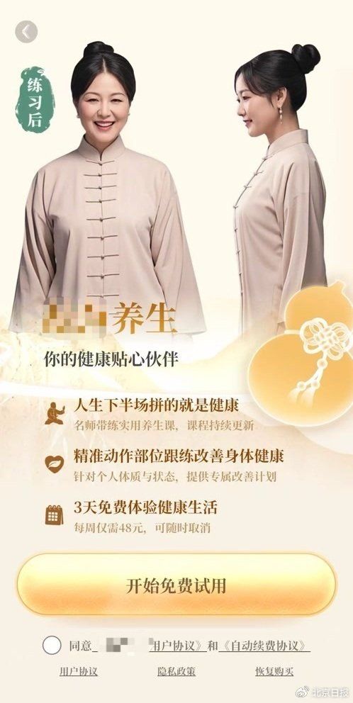 还有些App则更加离谱,下载完成后,点进去的第一步就是要购买会员,之后才能正常使用。但在购买流程上,平台却耍起了花招。比如一款提供“养生指导服务”的App,页面上会有一个大大的按钮,写着“开始免费试用”。但在按钮的旁边,却有一行非常不起眼的小字:“每周仅需48元,可随时取消”。而一旦用户点击开始试用,系统就会跳转到自动续费的开通界面。如果是辨别能力差的老人,可能还以为是在填写什么注册信息。