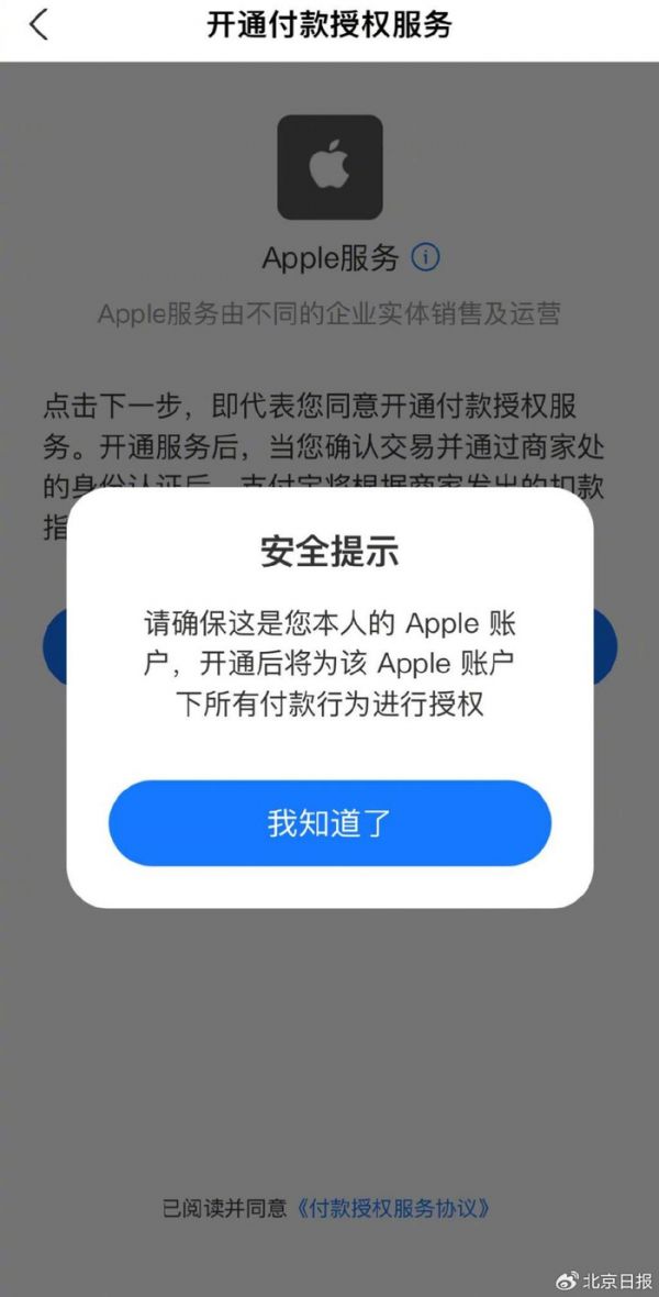 而在扫码之后,会进入开通付款授权服务的页面,这也是高先生感到有些“蹊跷”的步骤。这时,系统会弹出一个安全提示:“请确保这是你本人的Apple账户,开通后将为该Apple账户下所有付款行为进行授权”。记者将这个截图发送给了高先生,他表示,当时好像有这么一个提示,但他以为这里所说的账号是自己的账号,并不知道指的是骗子的账号。
