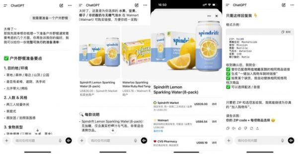 小编同样对其进行了测试,当询问“我需要准备一个户外野餐”时,ChatGPT不仅会列出所需物品清单,还会从沃尔玛商品库中匹配相应商品,生成“一键购买”购物车。在用户确认购买需求后,可直接使用绑定的支付方式完成结账,整个过程无需离开对话界面。