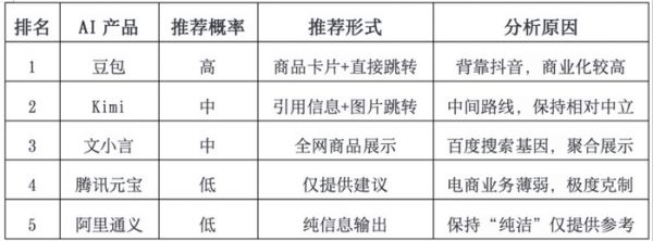 测试显示,豆包AI的商品推荐有明确触发逻辑。我们整理了不同品类的触发情况:
