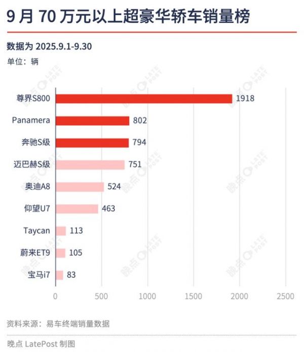 尊界 S800 的表现则更为自信,作为一款定价在 70.8 万元至 101.8 万元的超豪华轿车,上市 87 天大定突破 1.2 万辆。在首个完整交付月 9 月的销量为 1918 台,创国产超豪华轿车单月销量新高,这也超过了保时捷 Panamera(802 辆)和奔驰 S 级(794 辆)的总和。