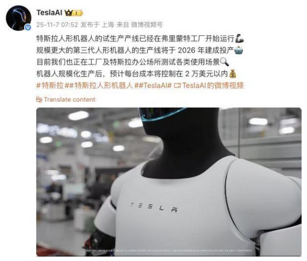 网址: 特斯拉官宣!第三代人形机器人生产线将于2026年建成投产,预计每台成本将控制在2万美元以内!马斯克最新发声 http://m.xishuta.com/newsview144028.html