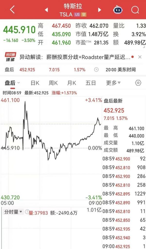 截至当地时间11月6日收盘,特斯拉报445.91美元,跌幅3.50%。值得注意的是美股盘后,特斯拉一度涨超3%。