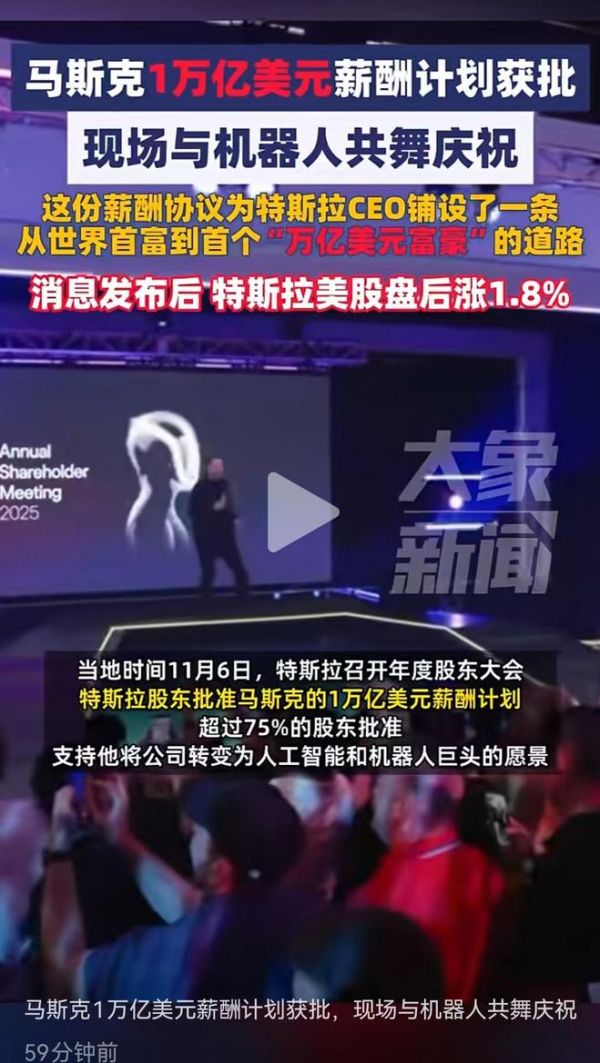图片来源:每经记者 张建 摄北京时间11月7日凌晨,特斯拉召开年度股东大会,特斯拉股东批准马斯克的1万亿美元薪酬计划,超过75%的股东批准,支持他将公司转变为人工智能和机器人巨头的愿景。