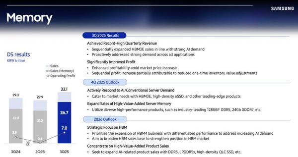 从业务结构来看,设备解决方案(DS)部门营收33.1万亿韩元,环比增长19%,其中Memory业务营收26.7万亿韩元,环比增长26%,同比增长20%,占集团总营收的31%,成为本季度拉动业绩的“发动机”。
