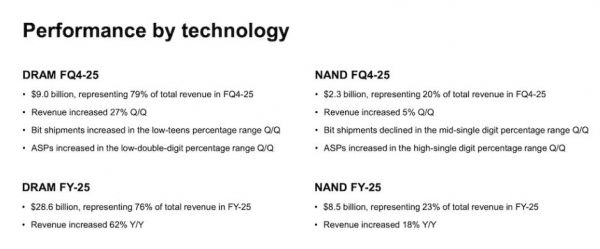 数据中心业务成为美光最大的增长亮点,2025财年美光数据中心业务占总营收的56%,HBM、高容量DIMM、服务器LP DRAM产品合计收入100亿美元,较上一财年增长超五倍;仅第四季度HBM收入就接近20亿美元,年化营收达80亿美元。DRAM业务营收90亿美元,占总营收79%,ASP环比提升11%,出货量环比增长14%;NAND业务营收23亿美元,占比20%,均价环比增长9%,数据中心固态硬盘业务市场份额创下纪录。