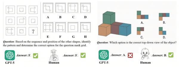 例如,GPT-5可以正确解出复杂图形逻辑题,但面对判断立方体俯视图这类空间题时,却出现了明显错误。这类题对人类儿童来说往往是直觉判断,却仍难住了顶级模型。